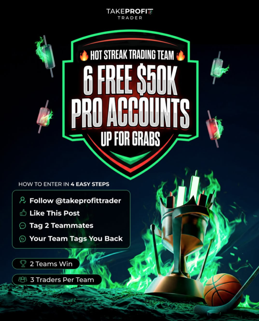 TakeProfitTrader has introduced a new giveaway, inviting traders to participate in its “Hot Streak Trading Team” challenge. The initiative centers around teamwork and engagement, offering participants a chance to secure one of six free $50,000 PRO trading accounts.